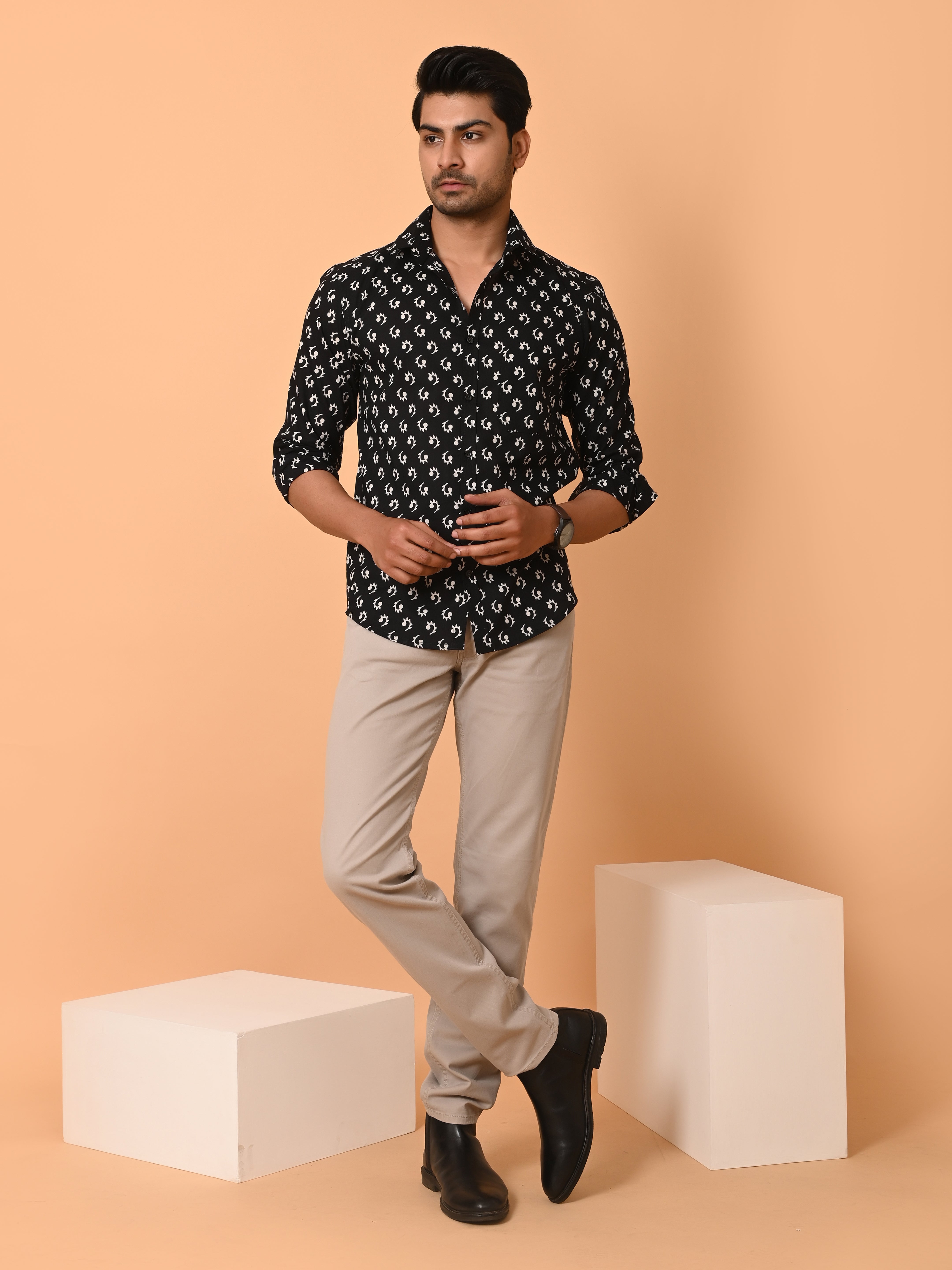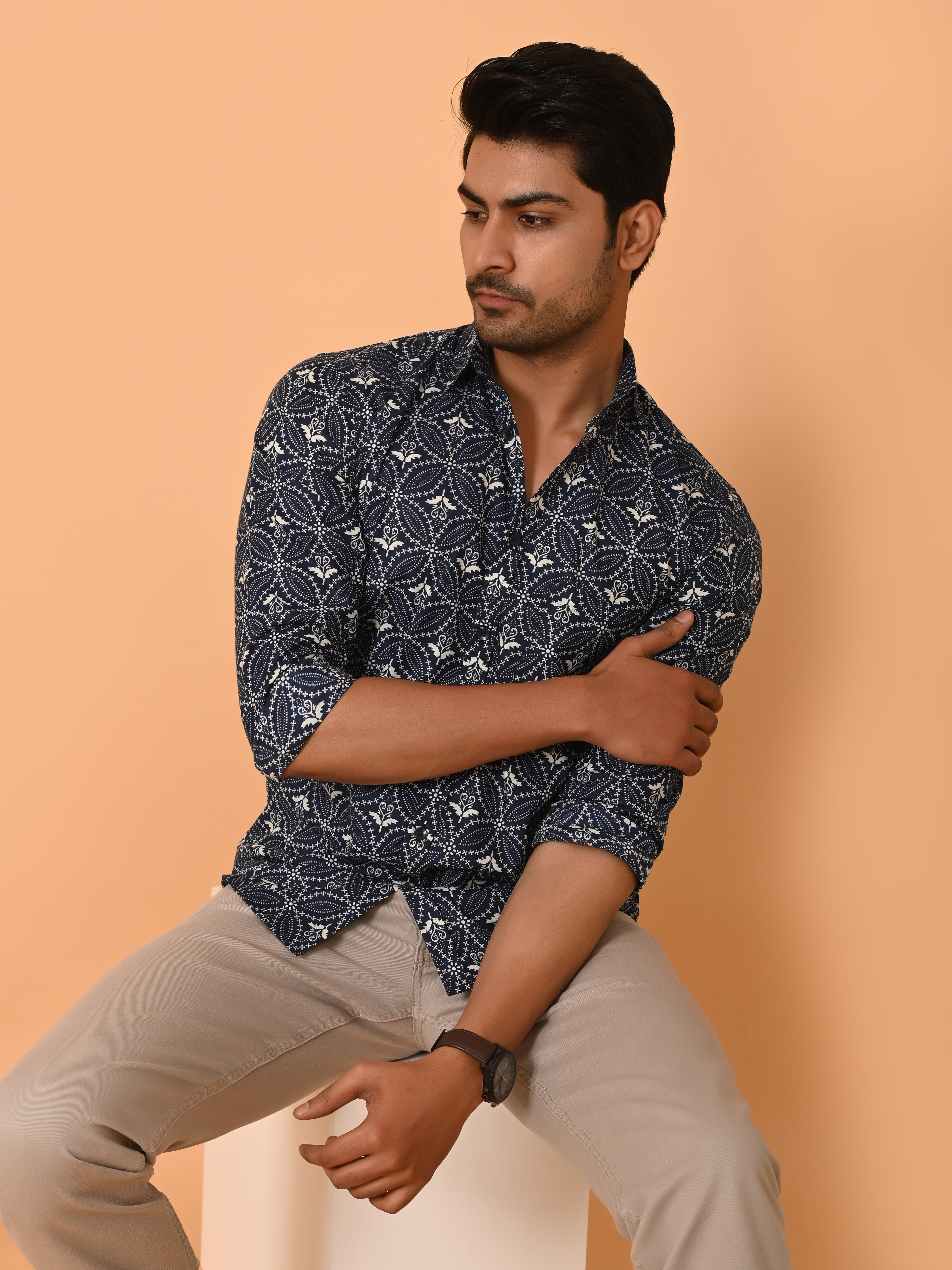 "Geometric Poise: Precision Print Cotton Shirt"