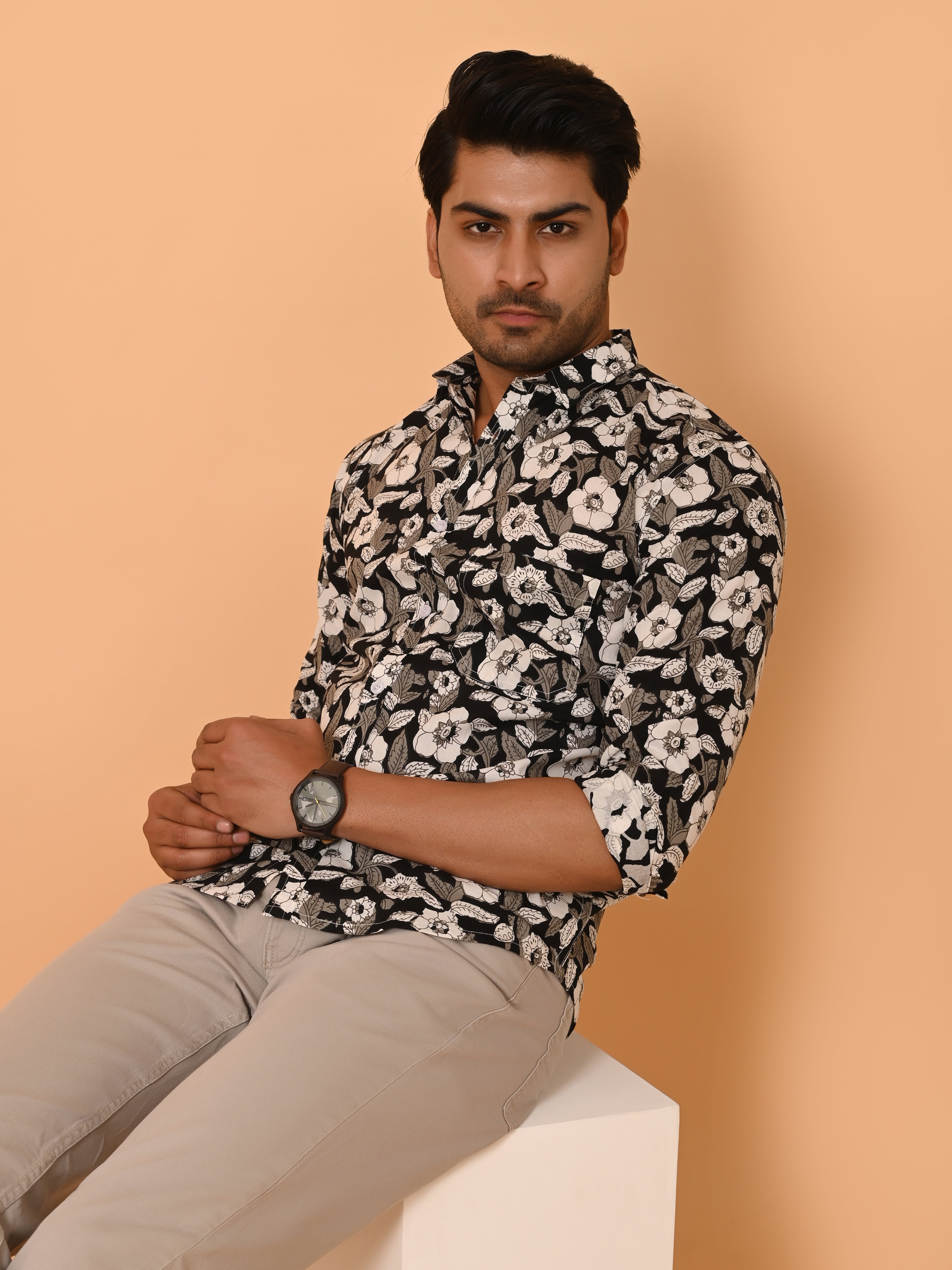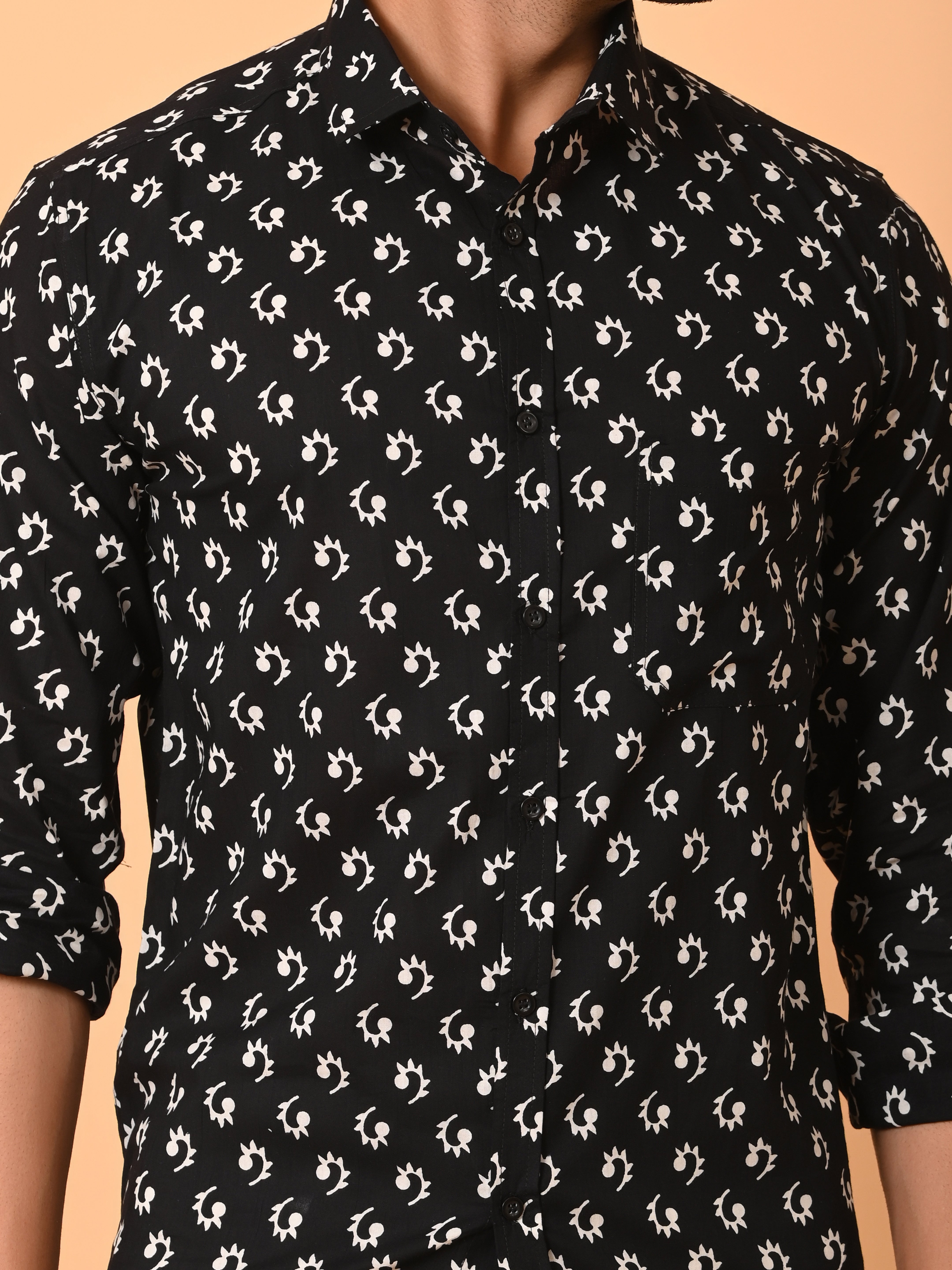"Monochrome Elegance: Rose Print Cotton Shirt"